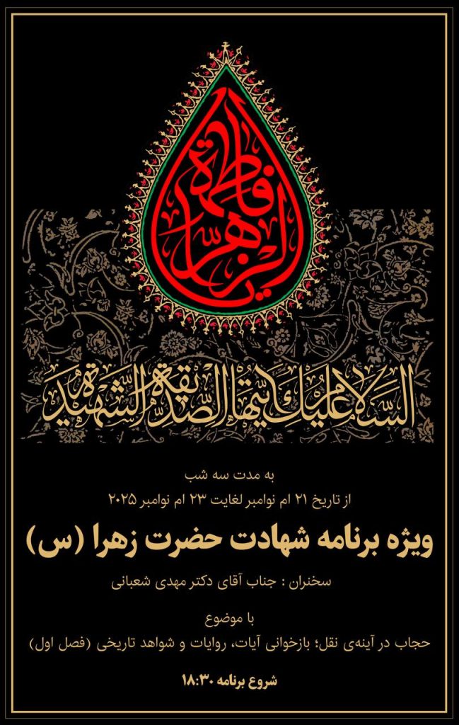 فرا رسیدن ایام فاطمیه بر تمام شیعیان تسلیت باد. مجلس عزاداری در تاریخ شنبه ۲۲ نوامبر برقرار خواهد بود.